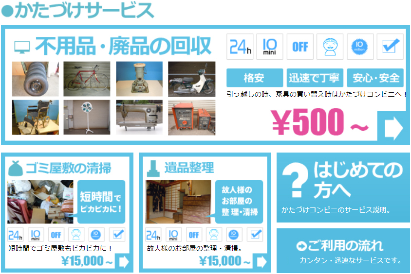 | 主な業務 | 古物の売買業 / 産業廃棄物収集運搬業 / 廃品回収リサイクル業 / 片付け及びハウスクリーニング業 家電家具配送設置業 / 荷造梱包業 / 倉庫業 / 軽作業手伝い業 |