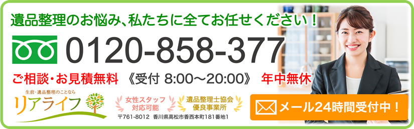 | 主な業務 | ◆生前・遺品整理事業 遺品整理、生前整理、不用品回収、ゴミ屋敷片付け、孤独死現場の特殊清掃・消臭消毒、遺品の供養、遺品の買取・リサイクル、ハウスクリーニング、終活イベントでの生前整理セミナーやブース出展など ◆不用品回収・買取事業 ご家庭の不用品回収、引越しの不用品回収、オフィスの不用品回収、遺品整理、ゴミ屋敷片付け・ハウスクリーニング、買取・リサイクルなど ◆貿易・リサイクル事業 回収した不用品の分別・リサイクル・リユース・海外貿易など ◆その他:ハチ駆除・伐採・骨董買取事業 ハチの巣駆除、伐採・草刈、骨董・アンティークの買取など |