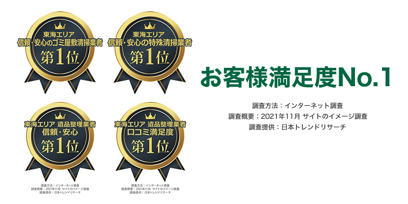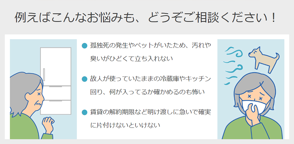 遺品整理、生前整理、特殊清掃、ゴミ屋敷清掃は見積無料。