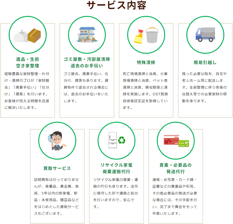 | 主な業務 | 1.遺品整理業(遺品整理、特殊清掃、ゴミ屋敷清掃、生前整理、空き家整理) 2.古物・中古・リサイクル品の売買 3.解体工事 |