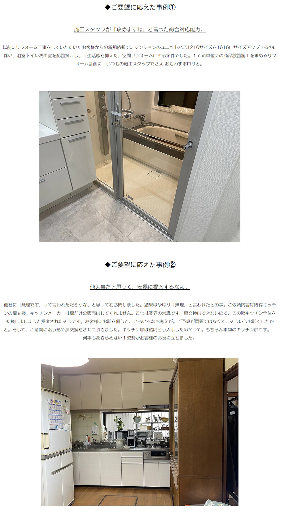 本業がリフォーム会社だから業者の出入りや打ち合わせなどの煩わしさがなく、また総合的に依頼していただくことで費用も安くできます。