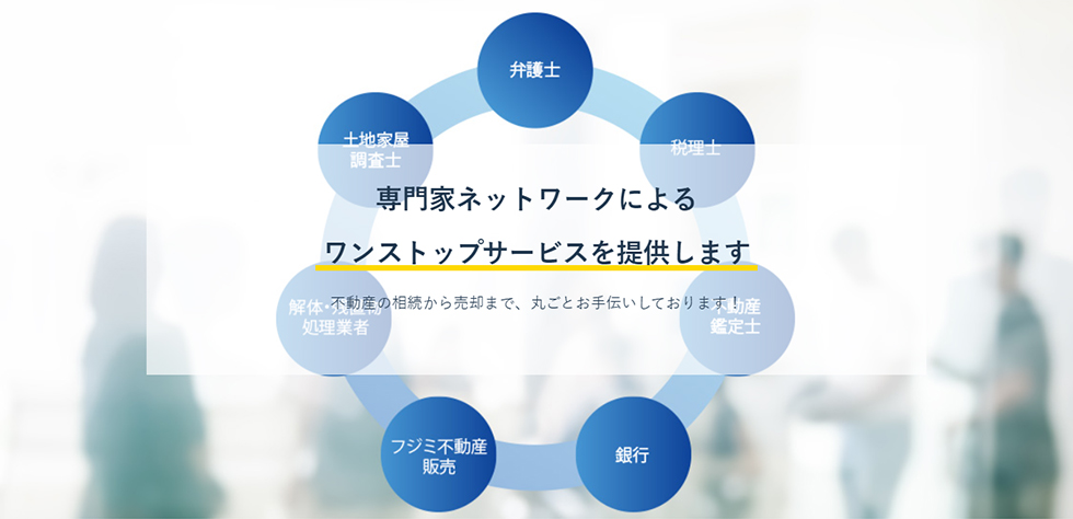 「空き家」となる原因の過半数を越えると言われる相続問題などによる不動産売却・相続税などの専門的なご相談も可能です。税理士、司法書士、弁護士などの各種専門家と連携してスムーズな相続をサポートします。