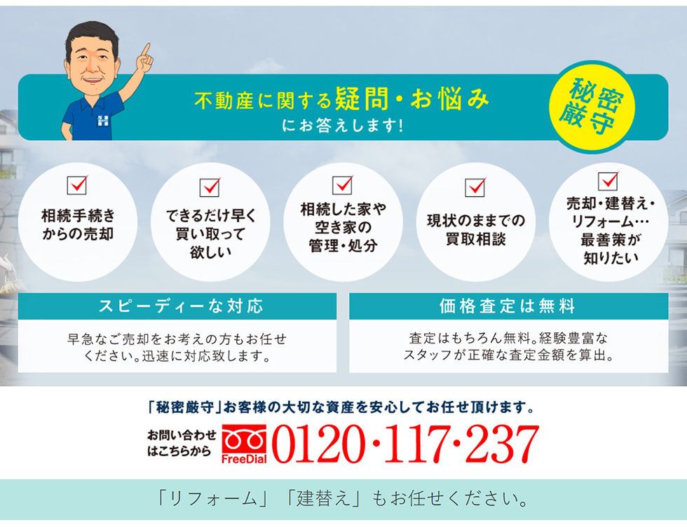 | 相談内容 | 空き家を売りたい, 空き家査定, 空き家のリフォーム・リノベーション, 空き家の解体, 更地にしてコインパーキング経営, 空きマンション・空き部屋の不動産投資 |