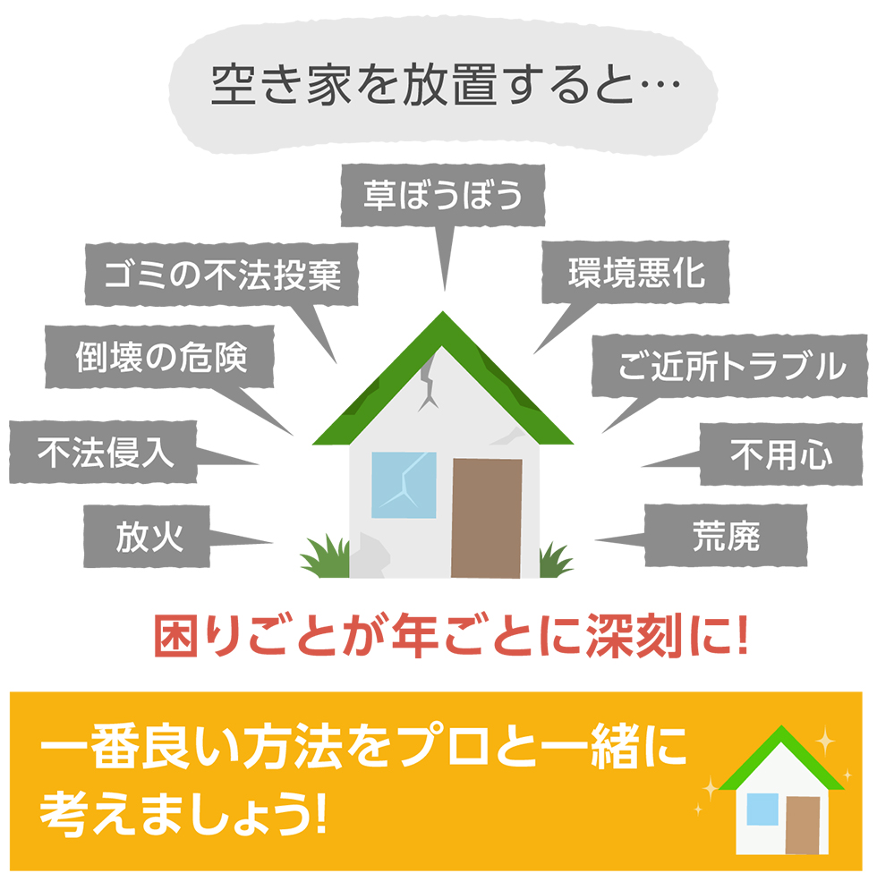| 相談内容 | 空き家の管理, 空き家を売りたい, 空き家査定, 一室補強, 空き家のリフォーム・リノベーション, 更地にしてコインパーキング経営, 空きマンション・空き部屋の不動産投資, 空き家を貸したい |