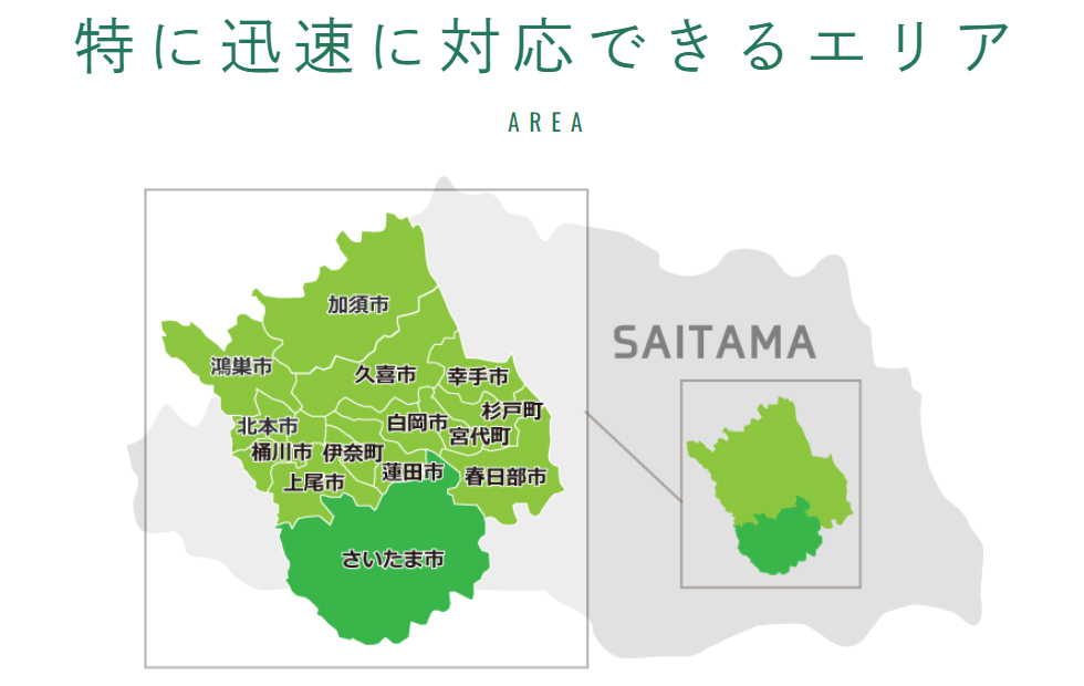 埼玉県白岡市、さいたま市、蓮田市、久喜市、春日部市、伊奈町、北本市、桶川市、上尾市を中心としてその周辺エリア