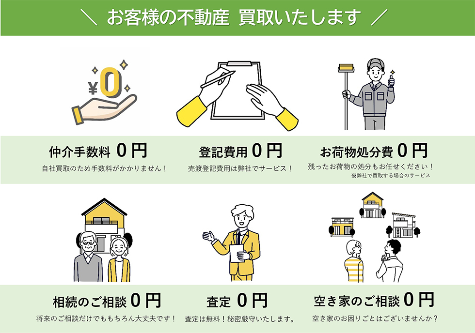 | 相談内容 | 空き家の管理, 空き家を売りたい, 空き家査定, 一室補強, 空き家のリフォーム・リノベーション, 空き家の解体, 更地にしてコインパーキング経営, 空き家を貸したい, 空き家買取, 空き家売却, 中古住宅・中古マンション・空き地買取 |