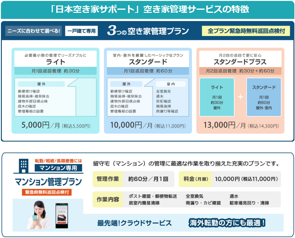 将来、使用する可能性のある不動産や、ご事情があり売却や賃貸に出せない不動産を、弊社で月に1回程度管理させていただきます。弊社は日本空き家サポートの提携店(空き家サポーター)です。空き家管理のレポートや、作業中の動画をクラウド上でご確認いただけます。