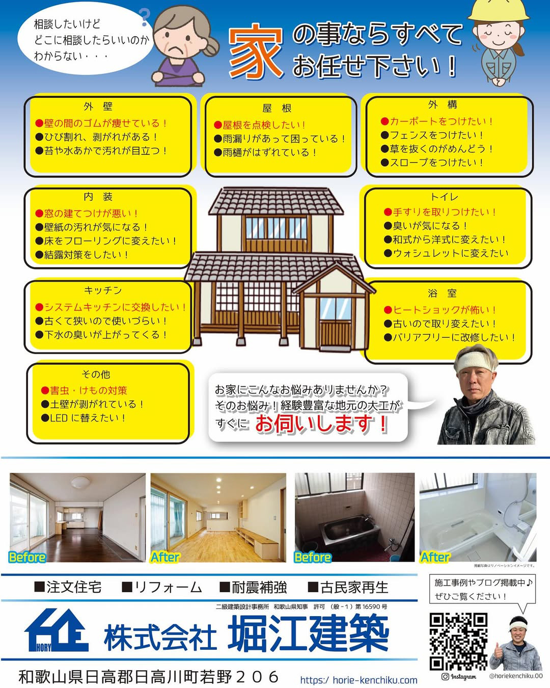 弊社は大工工事・リフォーム工事・家具製作などの業務に携わっている建設業者です。和歌山県日高郡・御坊市をメインに活動しております。