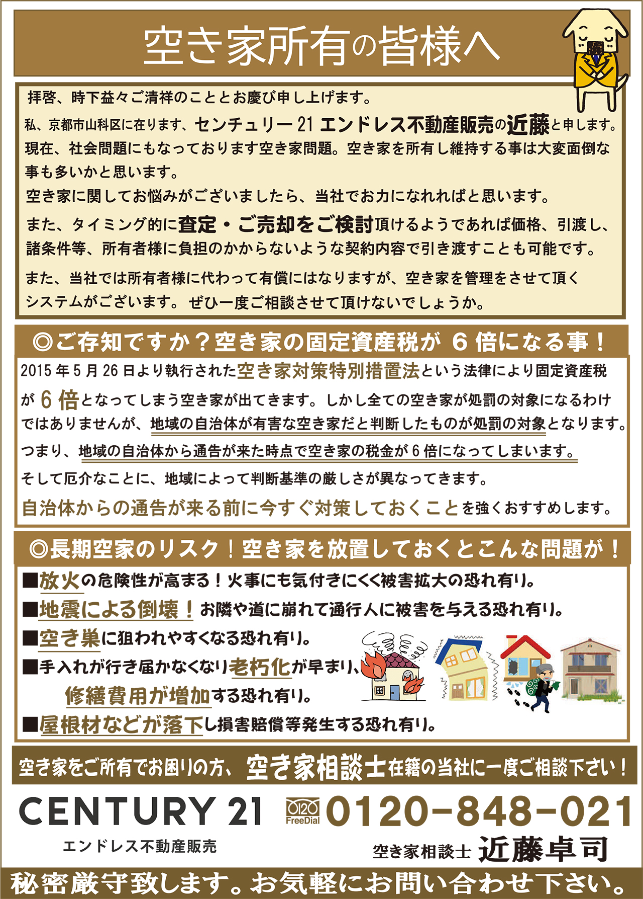管理不全空き家に指定されると、最大6倍に税金が上がる可能性がありますので、適切な管理をお勧めいたします。