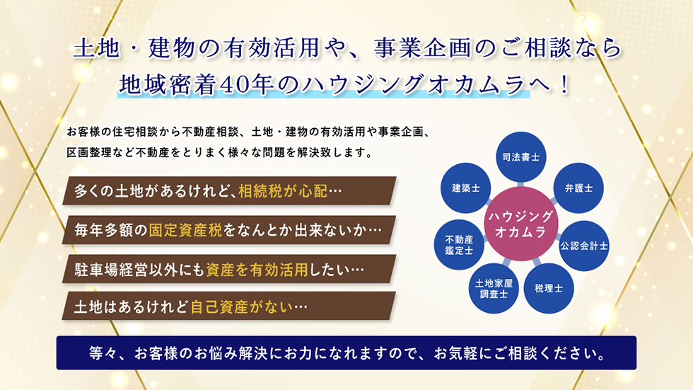 所有している不動産が遠方でお困りの方、まずはお電話・メールで、ご相談をお受けいたします。また、相続不動産の売却時の専門的なご相談も可能です。税理士、司法書士、弁護士といった各種専門家と連携してスムーズな相続をサポートします。