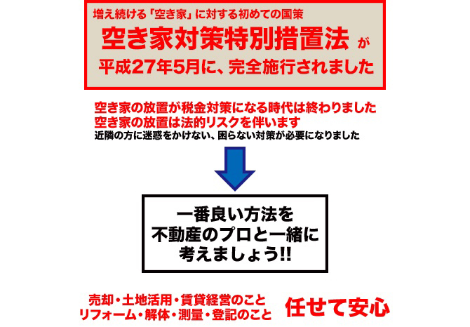 「空き家」となる原因の過半数を越えると言われる相続問題などによる不動産売却・相続税などの専門的な相談も可能です。