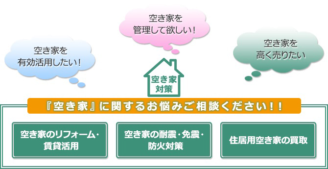 | 相談内容 | 空き家を売りたい, 空き家のリフォーム・リノベーション, 空き家の解体, 空き家を貸したい, リースバックのご相談 |