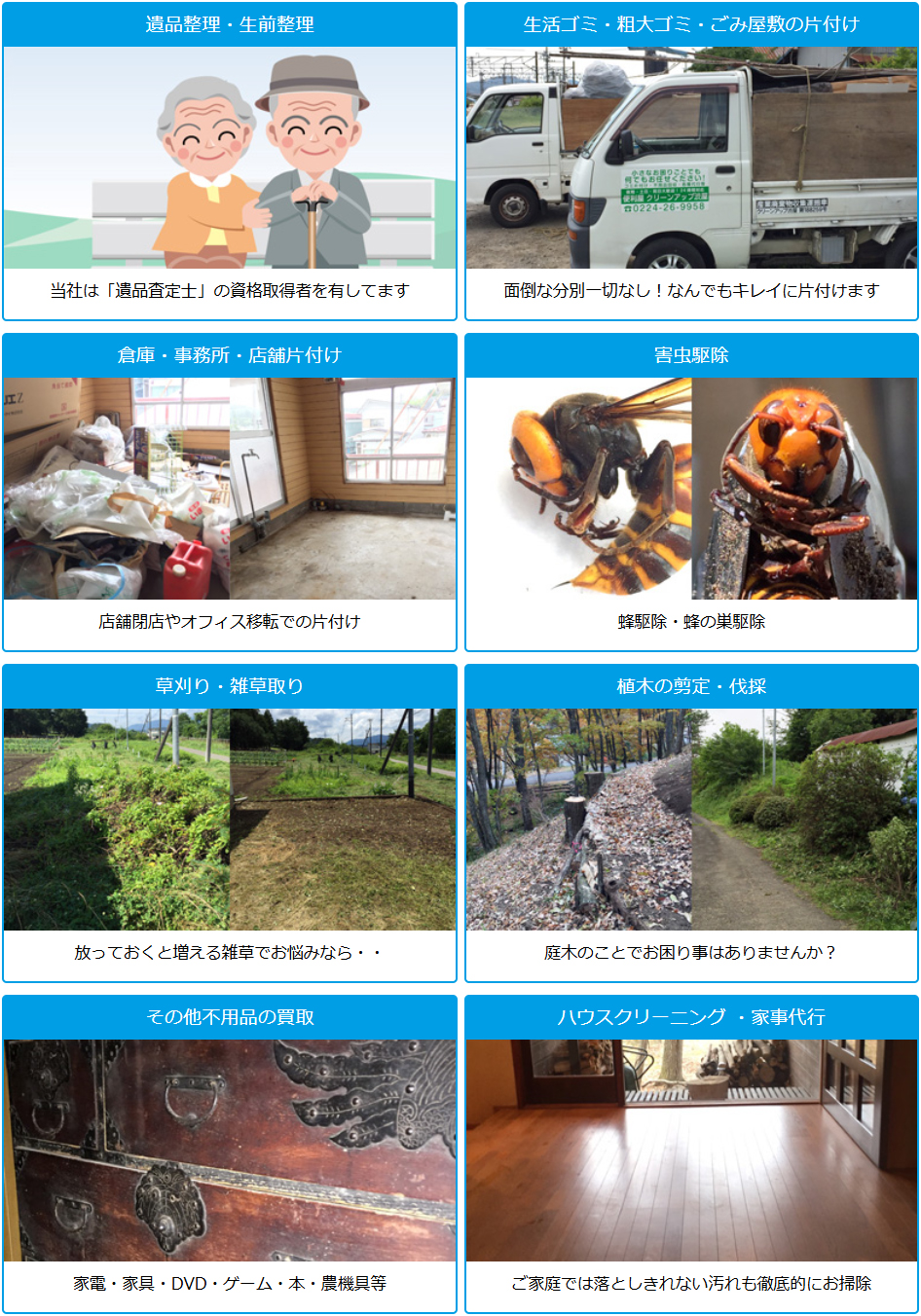 | 主な業務 | 空き家管理 生前整理 遺品供養 特殊清掃 ハウスクリーニング 古物商買取 |