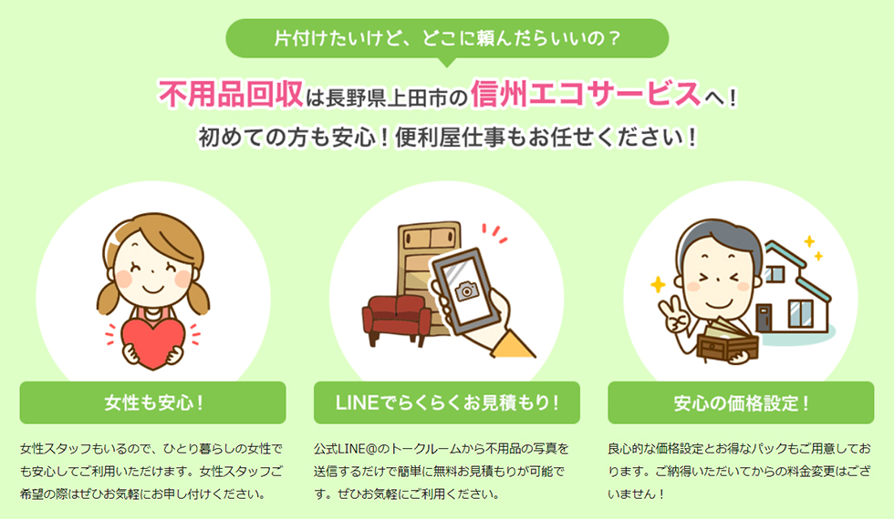 私達信州エコサービスは、遺品整理を通してご遺族の方が「気持の整理」も出来るようお手伝いさせて頂きます。
