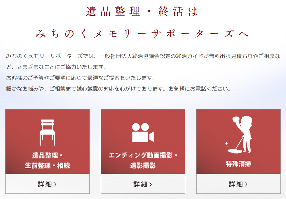 | 主な業務 | 遺品整理 生前整理 特殊清掃 不用品整理 空き家管理 |