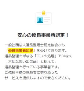 | その他 | 遺品整理士 IS08891号 事件現場特殊清掃士CSC01994号 古物商許可証 香川県公安委員会811110000895号 一般廃棄物処理業 許可番号 第58号 一般社団法人遺品整理士認定協会 優良事業所認定 |