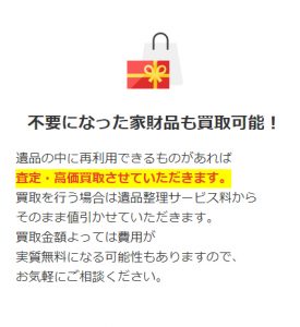 | 主な業務 | 遺品整理 生前整理 不用品整理 特殊清掃 空き家管理 家事代行 貴重品・処分品の仕分け 遺品の買取 権利品・貴重品の探索 仕分け・廃棄 倉庫の片付け リサイクル・買取代行 |