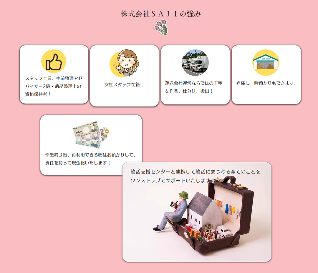 | 主な業務 | 遺品整理 生前整理 不用品整理 特殊清掃 消臭・消毒 |