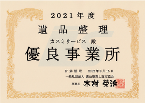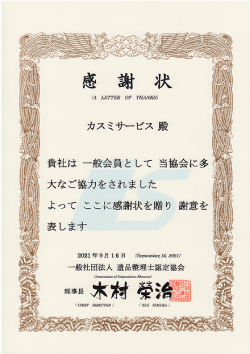 | その他 | 特定遺品整理士「認定 第 TS 10277 号」 遺品整理士 地区統括会員「認定 第lS 23051号」 事件現場特殊清掃士「認定 第 CSC 03035 号」 不用品回収健全化指導員「認定 第 FK 101701 号」 |