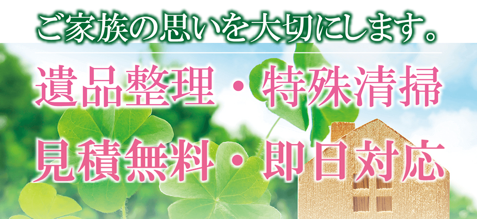 | 主な業務 | 遺品整理・生前整理・ゴミ屋敷・家財整理 特殊清掃・空き家整理・残置物整理 ハウスクリーニング・不用品片付けのお手伝い |