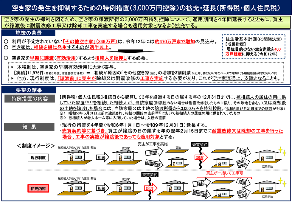空き家の発生を抑制するための特例措置(3,000万円控除)の拡充・延長(所得税・個人住民税) より引用